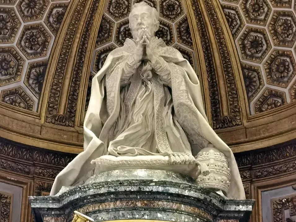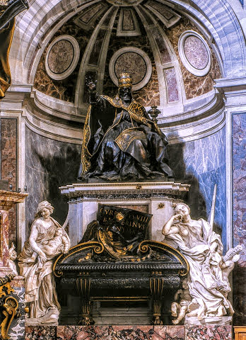 Nulla più di queste parole, scritte nel Seicento dallo storico Filippo Baldinucci, potrebbe descrivere al meglio lo splendore e la perfezione di questo sepolcro. La figura del pontefice, alta il doppio del normale, conclude la composizione, ed è accompagnata dalle personificazioni delle sue virtù. Uno scheletro alato, in bronzo dorato, si libra al di sotto del drappo realizzato in marmo pregiato e mostra al pontefice una clessidra: le ore del suo pontificato sono finite, la morte lo reclama.