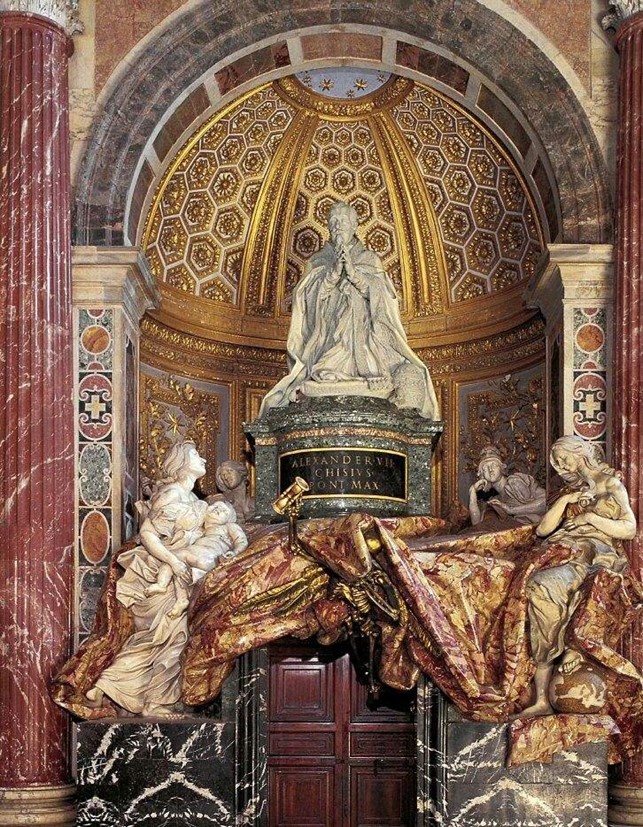 «Mostrò in questo sepolcro il cavalier Bernino la solita vivacità del suo ingegno, situandolo in una gran nicchia, ove è una porta. Finse egli che la porta fosse coperta da una gran coltre, che egli intagliò in diaspro di Sicilia; appresso figurò in metallo dorato la Morte che, entrando per essa porta, alza la coltre, colla quale, quasi vergognosa, si copre la testa, e porgendo un braccio in fuori verso la figura di Papa Alessandro, il quale egli fece inginocchiato in figura di marmo pel doppio del naturale, dimostra con un oriuolo in mano già esser finite l’ore sue. Da i lati nella più bassa parte veggonsi due grandi statue di marmo, rappresentanti l’una la Carità, l’altra la Verità. Nella parte superiore sono altre due statue, delle quali si vede la metà, e sono la Giustizia, e la Prudenza. Termina finalmente il tutto l’Arme di quel Papa».
