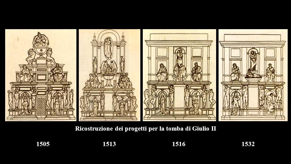 Il progetto per la tomba di Papa Giulio II fu protagonista di una storia travagliata. Subì numerosi cambiamenti e fu portato a termine solo 40 anni dopo la commissione del lavoro da parte di Giulio II a Michelangelo nel 1505. Lo storico dell’arte Ascanio Condivi, trattò di questa vicenda definendola la “tragedia della sepoltura”. L’idea iniziale era quella di realizzare un monumento a pianta rettangolare su tre livelli, all’interno della nuova Basilica di San Pietro. Dalla descrizione di Condivi che ci è pervenuta, sappiamo che la costruzione prevedeva una lunghezza di circa 10 m ed una larghezza di 7 m. Ogni lato doveva essere adornato da monumentali sculture, tra cui «statue legate, come prigioni, le quali rappresentavano le arti liberali, Pittura, Scultura et Architettura», prigioni che erano un chiaro rimando alla prigionia delle arti, con la morte del pontefice. Giulio II, infatti, era stato un grande mecenate, e per questo motivo con la sua scomparsa le arti sarebbero state imprigionate. Del progetto iniziale, Michelangelo aveva già iniziato a realizzare alcune statue, ma i lavori procedettero a rilento perché l’artista era impegnato anche nella realizzazione della volta della Cappella Sistina e in altre commissioni affidategli a Firenze.