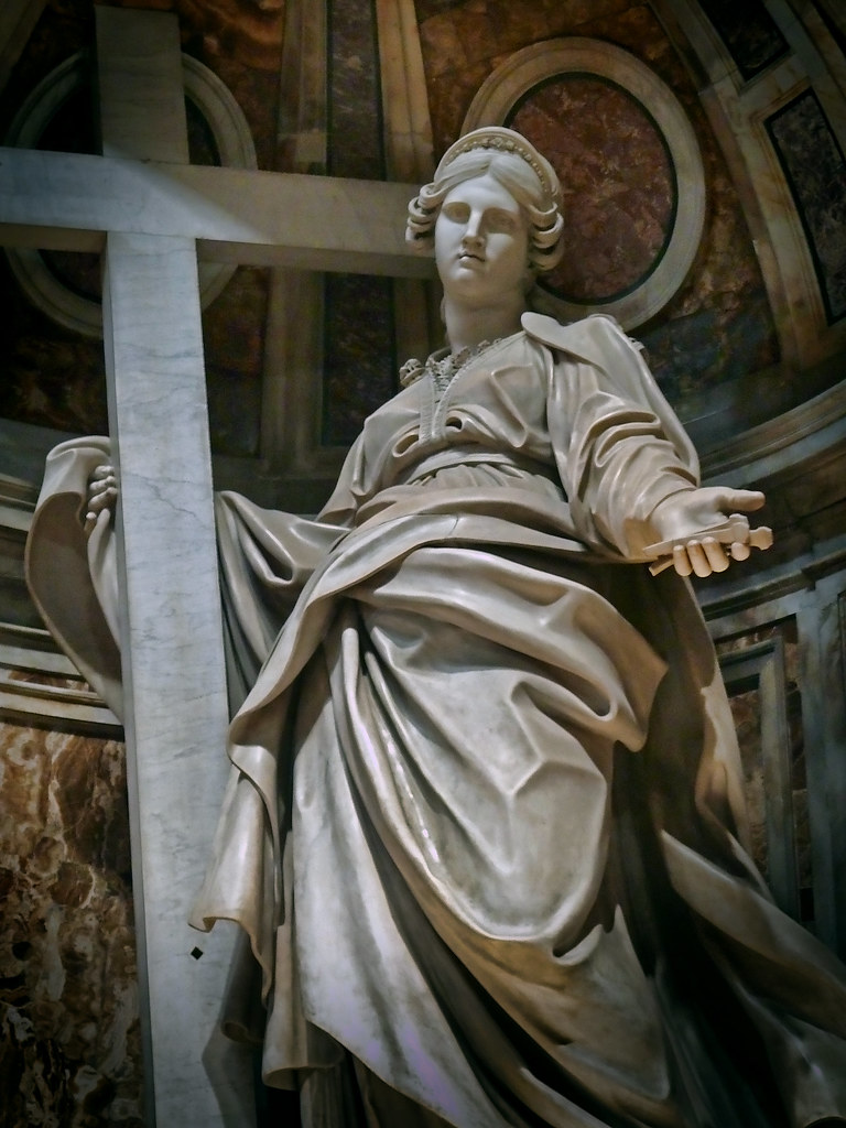 La statua di Sant’Elena, invece, fu posizionata nella nicchia ospitante un frammento della vera croce, rinvenuto, secondo la leggenda, da Elena, la madre dell’imperatore Costantino. Questa scultura fu realizzata da Andrea Bolgi.